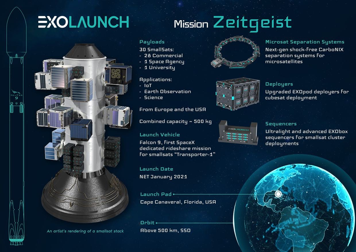 On this first dedicated rideshare mission of SpaceX’s SmallSat Rideshare Program “Transporter-1” Exolaunch successfully launched a total of 30 commercial, space agency, and university satellites for its customers from Europe and the U.S. Exolaunch mission, named “Zeitgeist” lifted off on January 24 at 15:00 UTC on Falcon 9, completing one of the largest and most diverse rideshare missions for the company. Zeitgeist kicked-off the first of several rideshares Exolaunch will manifest on Falcon 9 as part of a multi-launch agreement with SpaceX. On this mission, Exolaunch provided deployment, mission management and integration services to the German Aerospace Center (DLR), Dresden Technical University, ICEYE, NanoAvionics and other commercial companies for IoT, Earth observation and scientific applications.