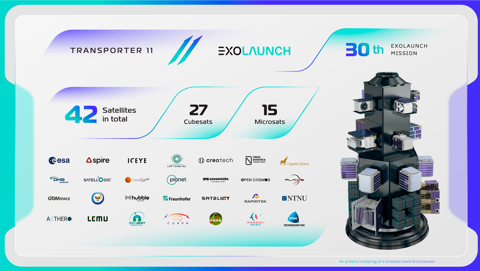 The majority of Transporter-11 customers received Exolaunch’s full service package which includes testing, integration, global shipping, and deployment of satellites. The satellites on this mission included 27 nanosatellites up to 16U and 15 microsatellites up to 200 kilograms, and were deployed via Exolaunch's renowned EXOpod Nova deployers and CarboNIX separation systems.