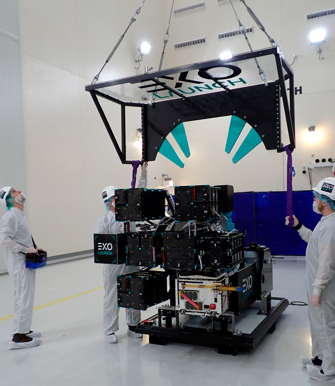 Integration of the EXOport multi-satellite adapter carrying customer satellites via EXOpod Nova deployers on Transporter-7 with the Falcon 9 launch vehicle. Image: © SpaceX