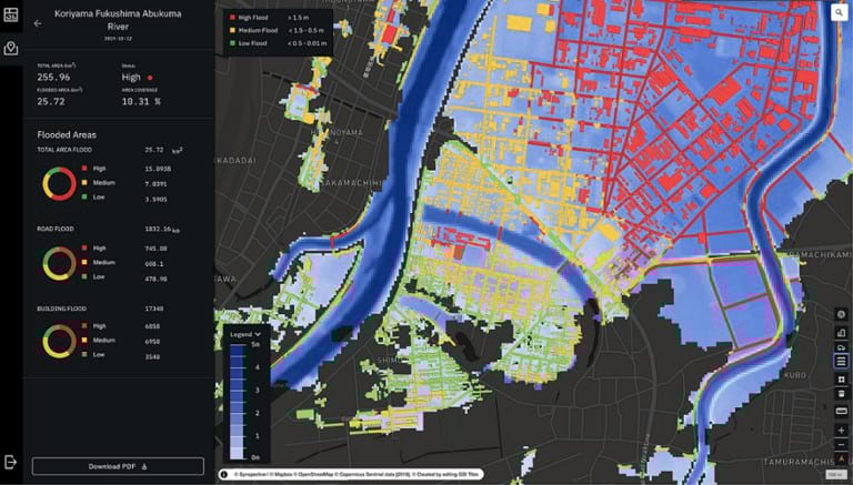 The “Flood Damage Assessment Solution" is a service that evaluates inundation damage (inundation area, inundation depth, damaged roads, damaged buildings) as a measure during a disaster response. In the event of a disaster, especially when affecting large areas, early information and fast action are critical. SAR satellites are capable of all-weather, anytime, ground observation, as such, when a flood occurs it is possible to quickly grasp the gravity of the situation and evaluate the damage without delays. Furthermore, by utilizing cutting-edge AI methods, the tool can also identify the level of impact on facilities, such as roads and buildings, in a speedy manner.