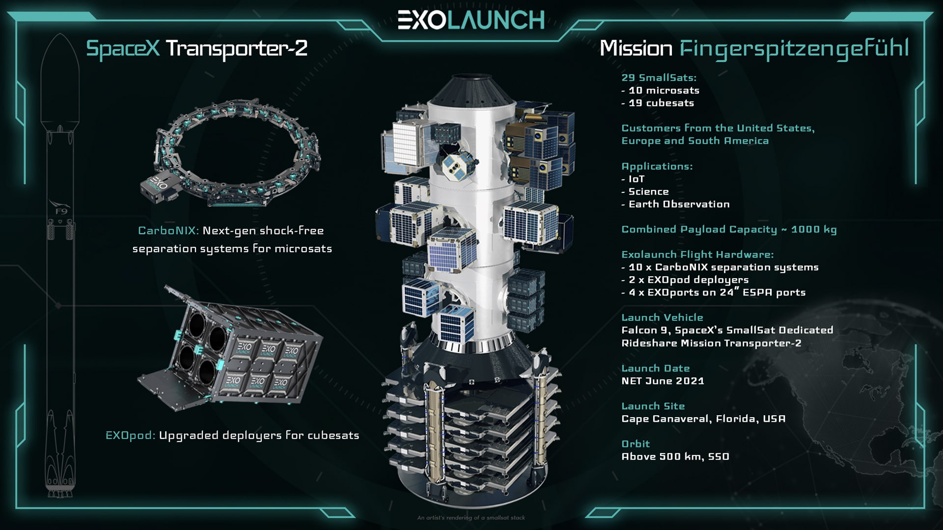 'Fingerspitzengefühl' is Exolaunch's 13th rideshare mission. It is also the second in a series of rideshares Exolaunch is manifesting on Falcon 9 as part of a Multi-Launch Agreement the company signed with SpaceX in 2020. On SpaceX's first dedicated SmallSat Rideshare Program mission Transporter-1 earlier this year Exolaunch launched 30 contracted satellites. For every Falcon 9 launch procured through the Multi-Launch Agreement with SpaceX, Exolaunch ensures comprehensive rideshare mission management, satellite integration and deployment services for its customers.