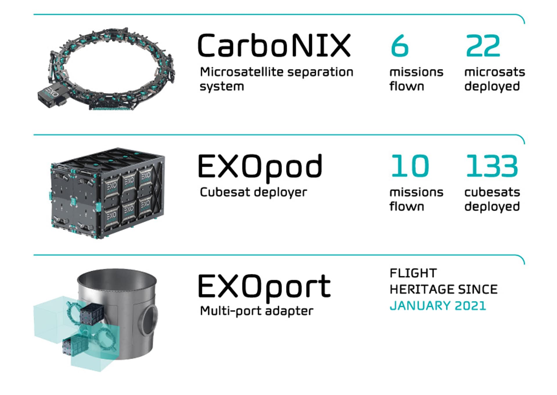EXOpod cubesat deployers and CarboNIX microsat separation systems are not only the pillars of the company's operations but are seen as a benchmark on the market being the most advanced deployment technologies in their segment to date. Developed in-house hardware can be customized based on specific dimension requirements posed by Exolaunch's customers planning to deploy their satellite constellations.